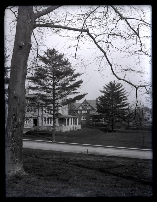 Glass negative showing a view of a grouping of large houses seen from across Pelham Road . Trees grow in the wide lawn in front of the houses and in the foreground of the photo.