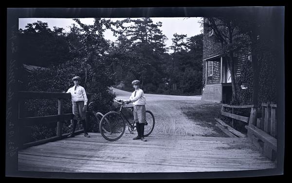 Film negative showing Marriott C. Morris' sons Elliston Perot Morris Jr. and Marriott Canby Morris Jr. as boys with bicycles standing on a wooden bridge near a mill at Sea Girt. The boys wear white shirts, hats, and ties. The mill stands behind the bridge to the right.