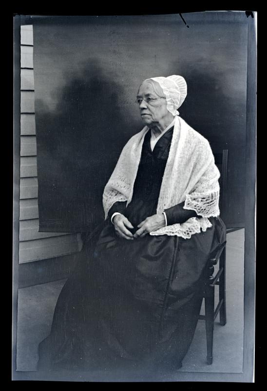 Film negative showing an elderly woman seated for a portrait in front of a backdrop on a porch. The woman wears a cap, lacy shawl and a dark dress.