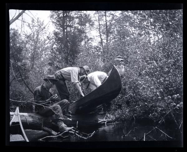 Film negative showing two men pushing a canoe over a fallen log into the Atsion River, i.e. Mullica River. Another man sits on the log to the left and a woman stands on the bank to the right, obscured by foliage. They all wear hats. Mullica River, also previously known as Little Egg Harbor River and Atison River, is named after Finnish settler Eric Palsson Mullica (1636-approximately 1704). The river starts in central Camden County and empties into the Great Bay north of Atlantic City.