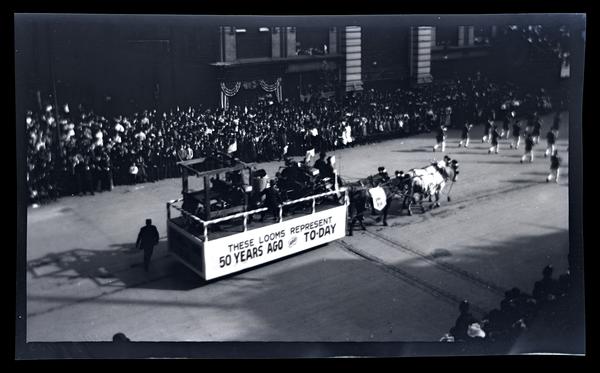 Film negative showing a parade float pulled by four horses featuring two different looms during the 225th Anniversary parade of Germantown. The side of the float reads "These looms represent 50 years ago and to-day." Crowds gather on either side of the street to watch the parade. The Bicentennial anniversary parade celebrated the first German immigrants to America and the first thirteen Quaker families who founded Germantown. Most of the events were actually held in Philadelphia, and included the parade, concerts, religious services, and a ball. A smaller annual holiday, German Day, began to be held in subsequent years in German-American communities.