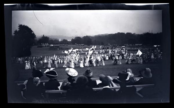 Film negative showing a group of people watching a crowd marching through the field below during the History Pageant at Fairmount Park, held October 7-12, 1912.