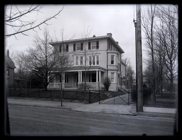 Glass negative showing a view of Marriott C. Morris' three-story house at 131 West Walnut Lane. The house has a porch and a front lawn dotted with trees and surrounded by a metal fence. A driveway runs along the right side of the house with a telephone pole standing at the entryway.