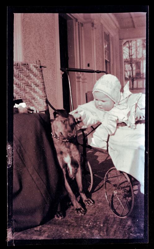 Film negative showing Marriott C. Morris' daughter Janet Morris as a baby in a carriage petting a dog on the porch at Morris' home at 131 W. Walnut Lane. She wears a white ruffled coat and hat. The medium-sized dog wears a studded collar. A woman's skirts are visible sitting to the left.