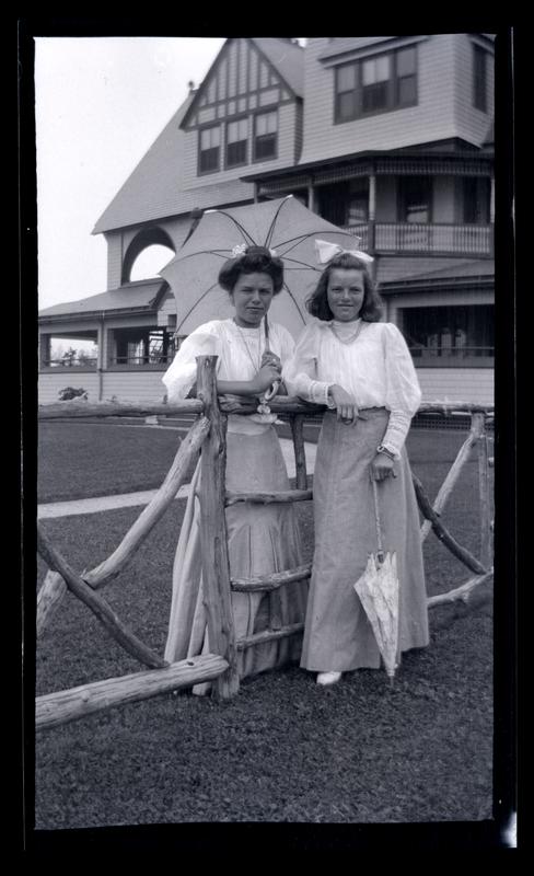 FIlm negative showing two young women standing on either side of a wooden fence. The girl on the left holds an open parasol over her head while the girl on the right holds a closed parasol. Both girls wear long skirts, white blouses, and ribbons in their hair. A multi-story home with a long porch and balcony on the second level stands behind them.