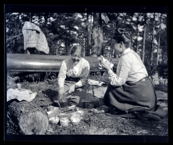 Film negaitve showing two smiling women kneeling on the ground around pots and other cooking untensils at Egg Harbor. The women wear white shirts and dark skirts. An overturned canoe rests in the clearing behind them.