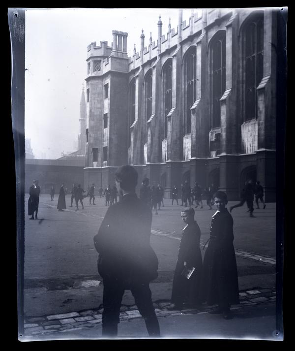 Film negative likely taken during Marriott C. Morris’ European honeymoon showing a group of young men wearing black robes walking through a courtyard. A boy wearing a dark suit walks away from the camera in the foreground. A large building with towers and crenellated roof stands behind the courtyard.