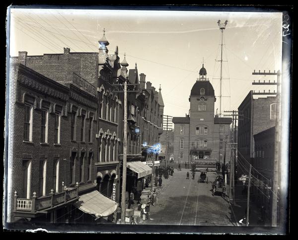 Glass negative showing a view of Patton Avenue terminating in the Court House, a large building with a clocktower. Carriages, people, and storefronts line either side of the street as telegraph lines crisscross overhead and trolley tracks run below.