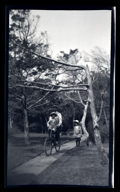 Film negative showing Marriott Canby Morris and one of his sons, either Elliston Perot Morris Jr. or Marriott Canby Morris Jr., riding a bicycle down a path lined with trees. Morris' other son walks in the grass to the right of the path.