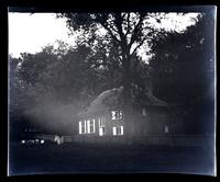 Film negative likely taken during Marriott C. Morris’ European honeymoon showing a two-story house with shuttered windows and a steep roof seen from across a field. A wooden fence stands between the house and a small graveyard on the other side.