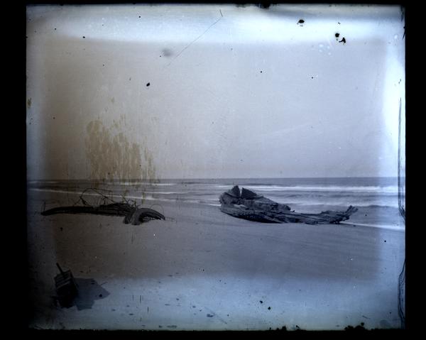 Glass negative showing debris scattered on the beach, possibly at Sea Girt. Waves break on the shore in the background.