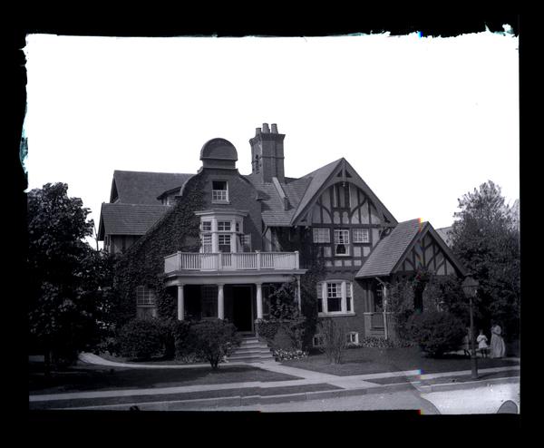 Film negative showing the twin two-story houses (6704 and 6706 Cresheim Road), including Marriott C. Morris’ (right) at 6706. The house has two porches, timber framing and ivy climbing up the front facade. A woman and two children stand in the grass in front of Morris' house.
