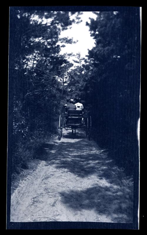 Film negative showing a rear view of a horse-drawn carriage traveling down a dirt road lined with trees at Sea Girt. A man and a woman sit in the buggy.