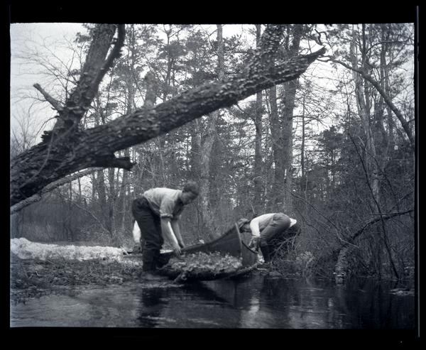 Film negative showing two men pulling canoes out of the water on the Egg Harbor riverbank. The bank is lined with slender trees and other foliage.