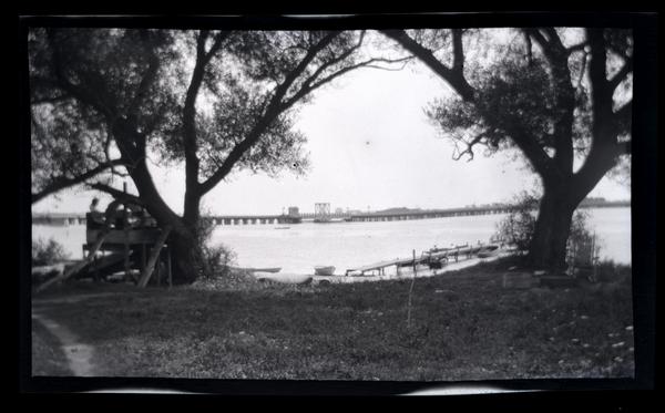 Film negative showing a view of a dock with rowboats tethered to either side on Wreck Pond. A raised wooden viewing platform stands on the riverbank next to a tree on the left. Various other piers and causeways travel over the water in the distance.