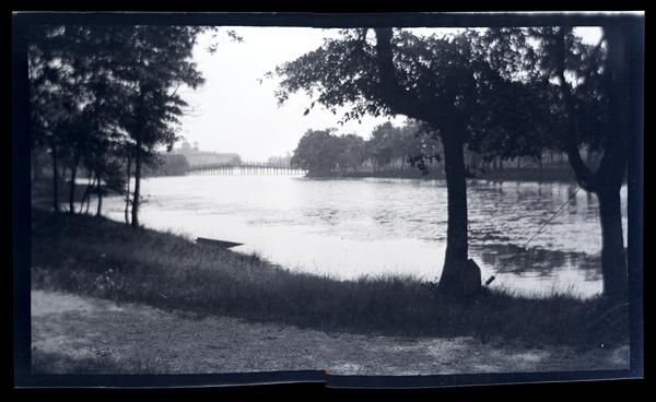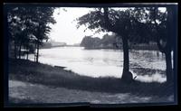 Film negative showing a view of a river with tree-lined banks at Sea Girt. A narrow bridge crosses the river in the distance.