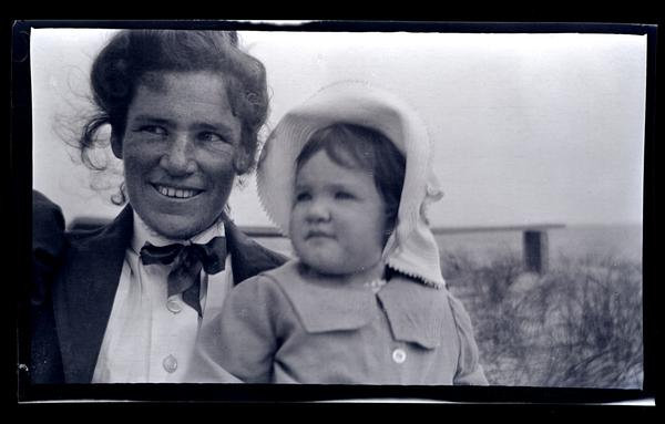 Film negative showing Marriott C. Morris' wife Jane Rhoads Morris holding their daughter Janet Morris as a baby. Jane Morris wears a dark jacket over white blouse with a ribbon around her neck and smiles. Janet Morris wearing a bonnet and coat. Dune grass is visible in the background.
