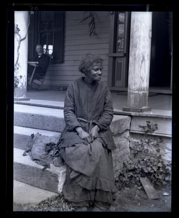 Glass negative showing Phebe Mills, an older African American woman, sitting on the porch steps of the McAboy House. She is attired in a long-sleeved shirt with buttons down the front and a tie across the waist and a long skirt with ruffles at the bottom. She sits with her hands balls and folded in her lap and looks slightly to the right. Beside her on the step lies her striped bonnet. A white man, wearing a white beard and attired in a suit, sits in a rocking chair on the porch and looks towards her. Also visible is a shuttered window and an open doorway. Phebe Mills, born circa 1806, was married to Pauldo Mills, a farmer on the Columbus Mills Plantation. Originally owned by John Mills, this plantation was bought by Dr. Leland Reid McAboy in 1872 and became an inn known as the McAboy House.