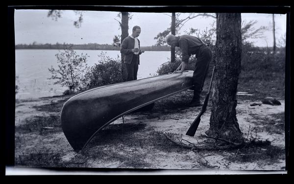 Film negative showing two men standing on either side of an overturned canoe near a river. The man on the left wears a sweater and holds a cup in his hand. The man on the right wears a shirt with rolled sleeves and bends over the canoe. A rifle leans against a tree on the right.