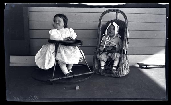 Film negative showing Marriott C. Morris' daughter Janet Morris and niece Sarah Rhoads Potts as babies on a porch. Morris on the left wears a white dress and sits on a wooden chair with a tray. Potts on the right wears a cap and sits in a wicker chair.