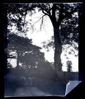 Film negative likely taken during Marriott C. Morris’ European honeymoon showing a view of three cows walking down a dirt path lined with trees and other foliage in England. A wooden fence stands on the right side of the path.