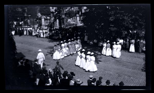 Film negative showing women marching in a formation of one horizonal and two diagonal lines during the 225th Anniversary parade of Germantown parade. The women wear white dresses and hats. People gather on either side of the street to watch the parade. The Bicentennial anniversary parade celebrated the first German immigrants to America and the first thirteen Quaker families who founded Germantown. Most of the events were actually held in Philadelphia, and included the parade, concerts, religious services, and a ball. A smaller annual holiday, German Day, began to be held in subsequent years in German-American communities.