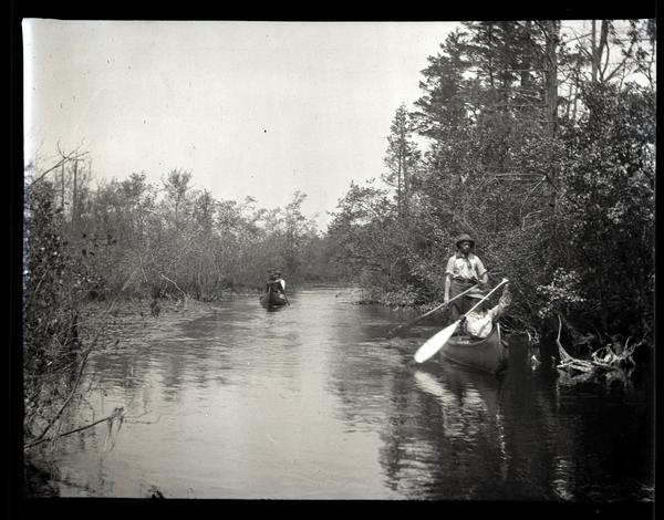 Film negative showing two canoes traveling down the Atsion River, i.e. Mullica River, lined with thick foliage. A woman sits in the front of the near canoe while a man stands in the back. The far canoe carries two men. Mullica River, also previously known as Little Egg Harbor River and Atison River, is named after Finnish settler Eric Palsson Mullica (1636-approximately 1704). The river starts in central Camden County and empties into the Great Bay north of Atlantic City.