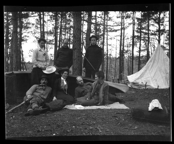 Film negative showing a group of four men and three women, including Marriott C. Morris' wife Jane Rhoads Morris and brother-in-law Thomas C. Potts, posing next to an overturned canoe at Egg Harbor. A partially erected tent stands on the right.