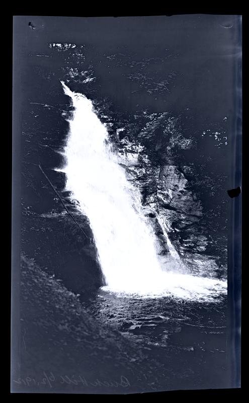 Film negative showing a view of a waterfall at Buck Hill Falls surrounded by a wooded hillside.