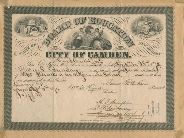 Board of Education of the City of Camden of the State of New Jersey second class certificate [graphic] / M.H. Traubel, Lith. 409 Chestnut St. Phila.