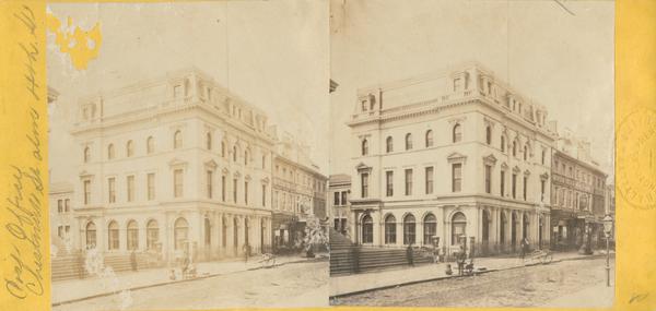 View of the U.S. Post Office and U.S. Courts building at the southwest corner of Chestnut and 5th Streets. Opened February 23, 1863, the building was used as a post office until 1884. View also shows commercial buildings on the south side of Chestnut.