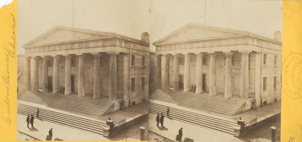 Exterior view showing the United States Custom House at 420 Chestnut Street, formerly the Second Bank of the United States (1816-1836), built in 1824 after the designs of Philadelphia architect William Strickland. U.S. Custom House occupied the site from 1845 to 1935. Includes pedestrian traffic and a partial view of a street vendor's stand near a gate.