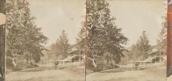 View showing a stretch of Lincoln Drive including Maple Spring Hotel, the roadhouse and picnic resort established around 1865. The hotel was known for proprietor Joseph Smith's prominently displayed hand-carved curios created from laurel root that he gathered along the Wissahickon Creek. The hotel fell into ruin following the loss of its liquor privileges and was razed in the late 19th century. A horse-drawn carriage travels down the wooded road.