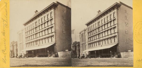 View from above Chestnut Street showing the hotel at Broad and Sansom streets opened by George W. and J.G. Edwards in 1853. The hotel built after the designs of John McArthur, Jr. was expanded and renamed the Lafayette Hotel in 1876. View also depicts adjacent buildings, including the Academy of Natural Sciences and the Union League; parked horse-drawn carriages; and broadsides pasted on a brick wall.