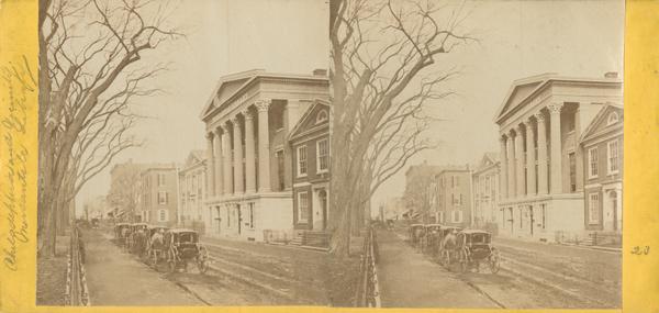 Views showing the library built 1844-45 after the designs of William Johnston at 125 South Fifth Street. Demolished circa