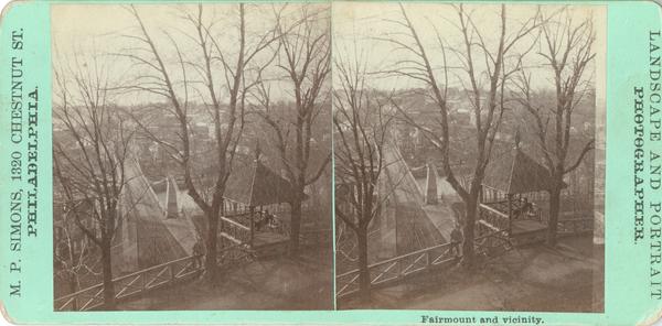 View looking west from above one of the rustic pavilions at the Fairmount Water Works showing the Wire Suspension Bridge spanning the Schuylkill River. The bridge, the first suspension bridge in the United States, was built between 1841-1842 after the designs of engineer Charles Ellet, Jr. It was removed in 1874. The pavilions, built near the reservoir at the waterworks between 1864-1866, were installed as a decorative improvement.