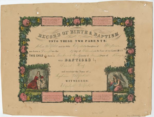 Library Company copy hand-colored; completed in MS. for Lydian Wolfskill (later Artz), born Dec. 13, 1866 in Brecknock Township,
