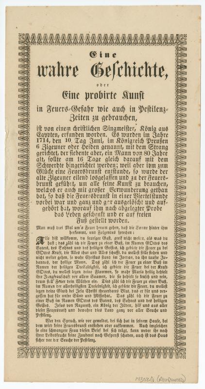 Eine wahre Geschichte, oder eine probirte Kunst in Feuers-Gefahr wie auch in Pestilenz-Zeiten zu gebrauchen. : Ist von einem christlichen Singmeister, König aus Egypten, erfunden worden. Es wurden im Jahre 1714, den 10 Tag Juni, im Königreich Preuszen 6 Zigeuner oder Heiden genannt, mit dem Strang gerichtet, der siebente aber, ein Mann von 80 Jahre alt, sollte am 16 Tage gleich darauf mit dem Schwerdte hingerichtet werden; ...
