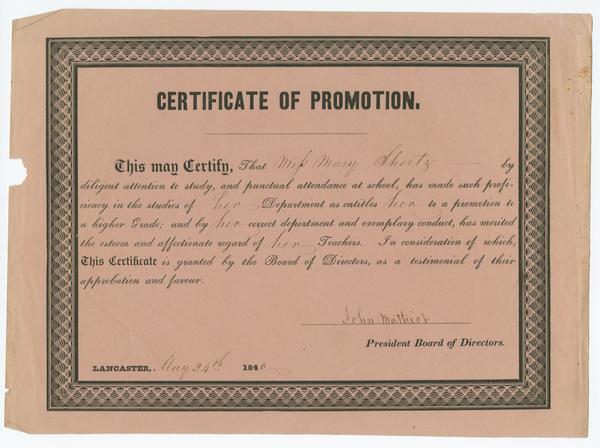 Certificate of promotion. : This may certify, that [blank] by diligent attention to study, and punctual attendance at school, has made such proficiency in the studies of [blank] department as entitles [blank] to a promotion to a higher grade; and by [blank] correct deportment and exemplary conduct, has merited the esteem and affectionate regard of [blank] teachers. In consideration of which, this certificate is granted by the board of directors, as a testimonial of their approbation and favour. / [blank] president board of directors. Lancaster, [blank] 184[blank]
