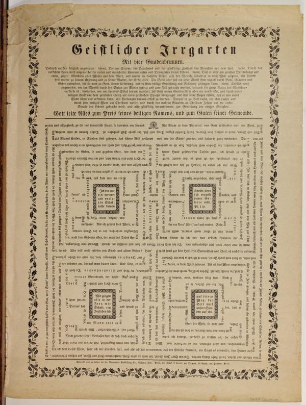 Representation of Christian life as a journey through a maze. The typographical layout of the text follows a maze-like pattern.