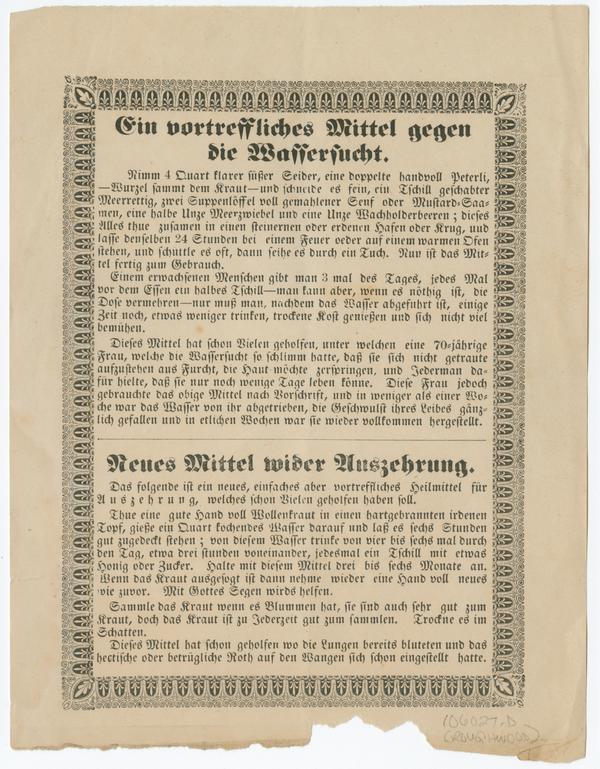 Ein vortressliches Mittel gegen die Wassersucht. : Nimm 4 Quart klarer süsser Seider, ... Neues Mittel wider Auszehrung. ...