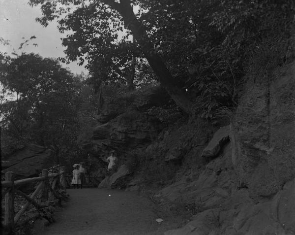 [Three girls on trail, along Wissahickon Creek, Fairmount Park] [graphic].