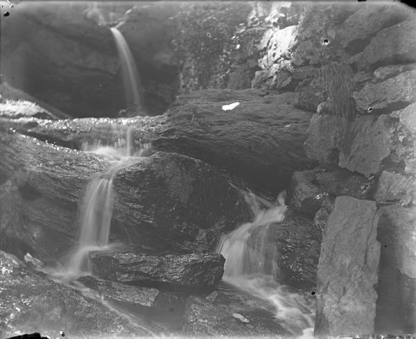 Possibly depicts the waterfall over the remains of a stone dam underneath of the Blue Stone Bridge over Wissahickon Creek.