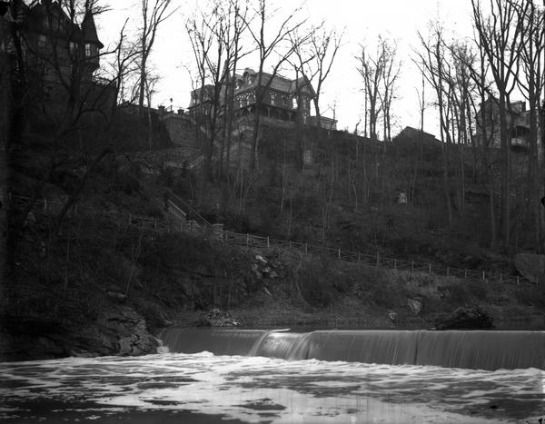 View of the 100 steps from the Wissahickon Creek. A small waterfall is visible in the foreground, and large houses along Freeland Avenue are perched at the top of the hill overlooking the creek.