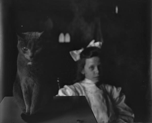 Depicts a dark-haired cat perched on an unidentifiable surface in the foreground, and the photographer's daughter, Alice Berry, attired in a light colored dress with a large bow in her hair, looking at the camera from the background.