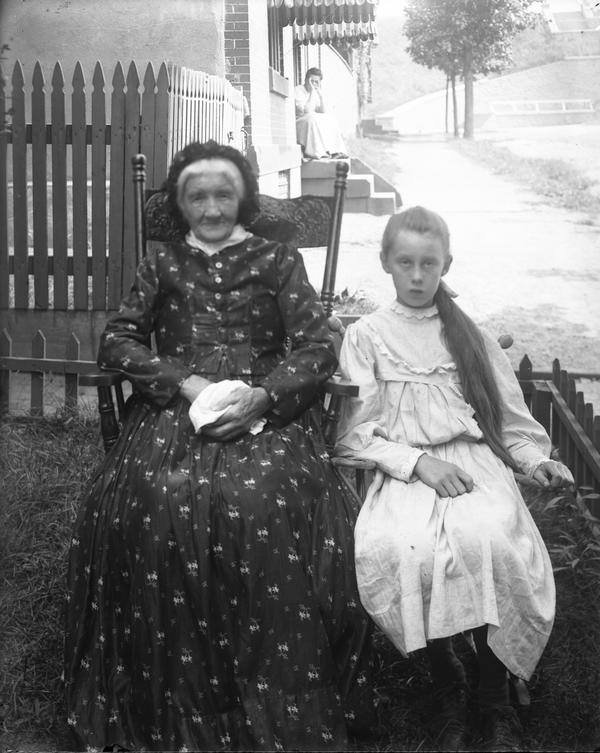 Depicts an older woman wearing a dark, flower-print dress, sitting in a rocking chair next to a young girl in a light colored dress, her hair tucked into a ponytail pulled over her shoulder and extended down below her waist.