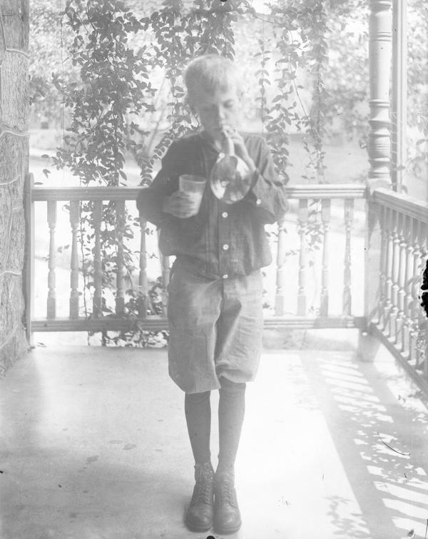 Depicts the photographer's son, Frank W. Berry, blowing a large bubble from a pipe, holding a cup of soap in his right hand. He stands on the front porch of the family home in Manayunk.