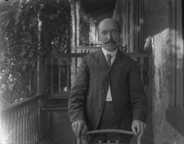 Waist-length portrait of Frank Berry, Sr., standing on the porch of his residence at 201 Righter Street in Manayunk. He stands behind a chair on the porch, gripping the top of the chair for support. Berry is in his mid-forties in this photo, balding with a mustache, and is attired in striped trousers, a tie and a single breasted jacket buttoned only in the first hole.