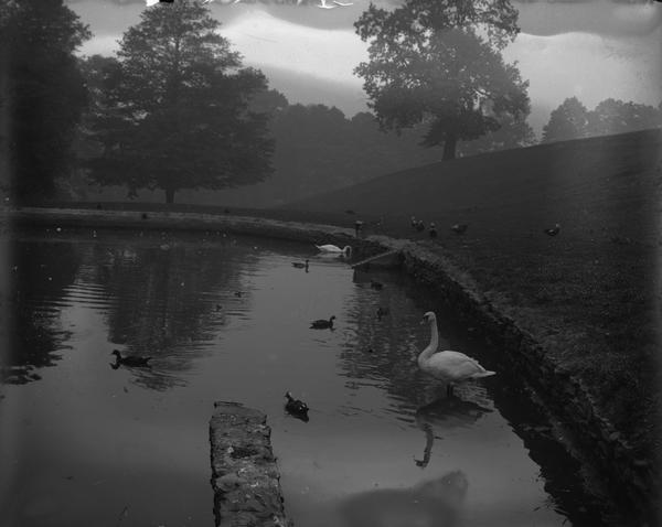 View of ducks and swans wading in an unidentified stone-lined lake, presumably one of several lakes in Fairmount Park.