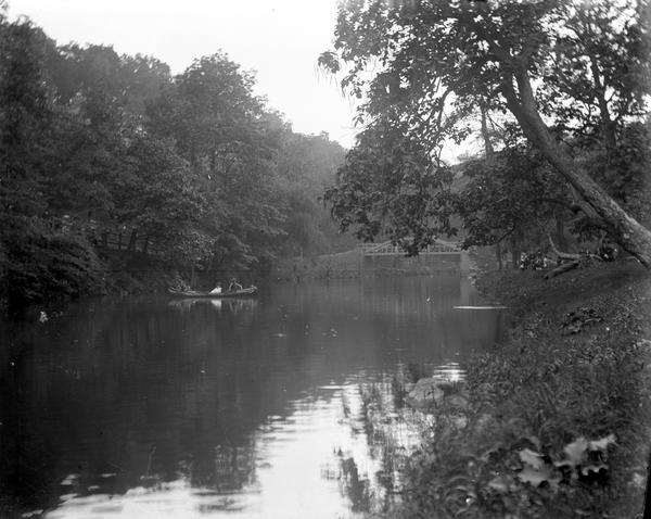 View of four people sitting in an "Ajax" canoe in the Wissahickon Creek near Forbidden Drive. The bridge in the background is possibly the Log Cabin Bridge. Two groups of people sit along the bank of the creek (right) in the distance.
